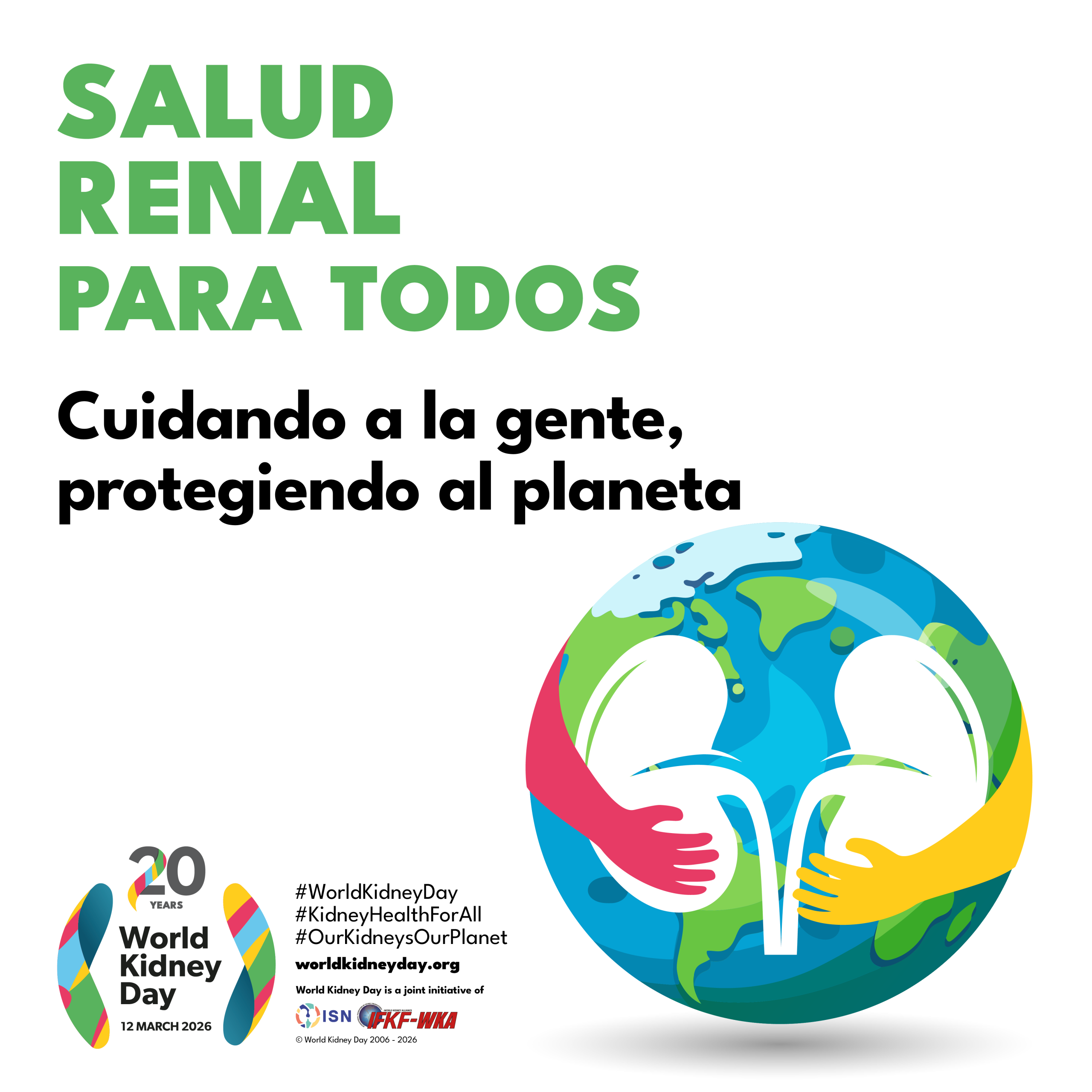 El 12 de marzo de 2026 se celebra la 20ª Edición del Día Mundial del Riñón, iniciativa de la Sociedad Internacional de Nefrología y de la Federación Internacional de Fundaciones Renales a la que se suman todas las sociedades científicas del mundo.